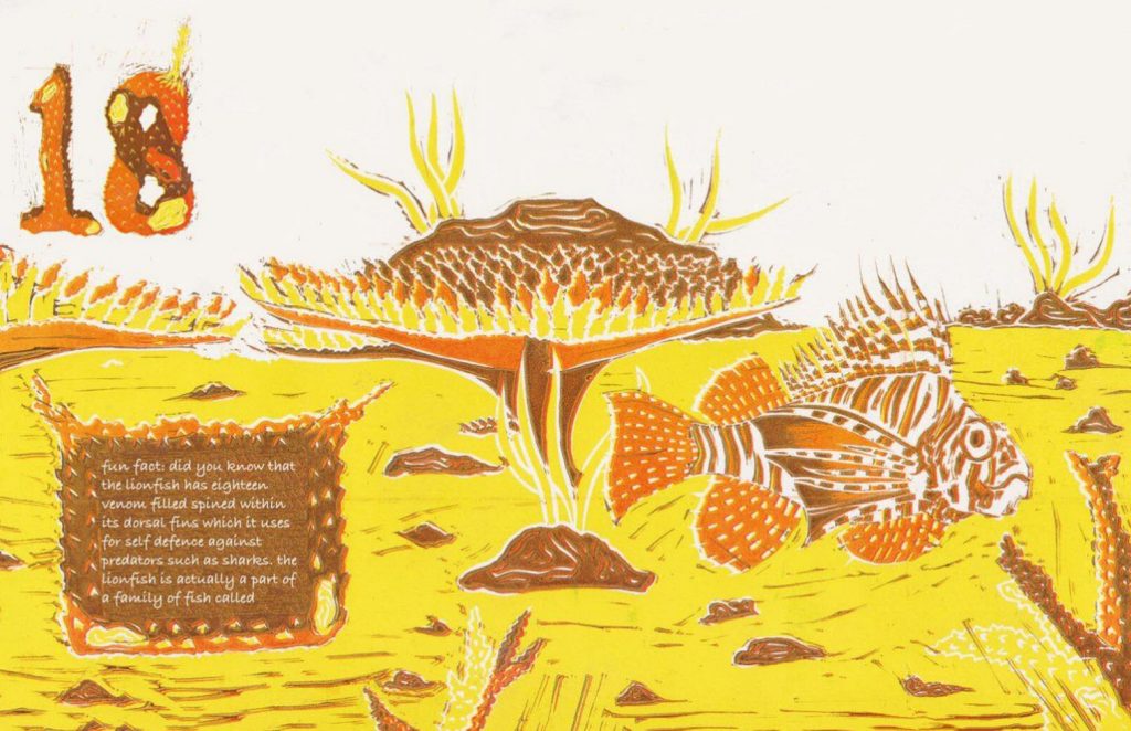 This is another example of my counting and marine life lino print collection, this time that of a poisonous lionfish; each of the animals selected for these prints would have a relevance to the number presented, for instance, I chose a lionfish for the number 18 as the fish has 18 venom coated spines on its dorsal fin.