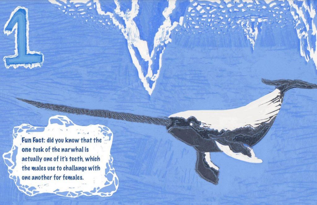 This print was inspired by me via a project which I undertook in University; the brief was to create a series of double page spread about both counting and marine life. This one consists of a narwhal with a glacial environment; I had quite a bit of fun creating the reflections of water on the surface.